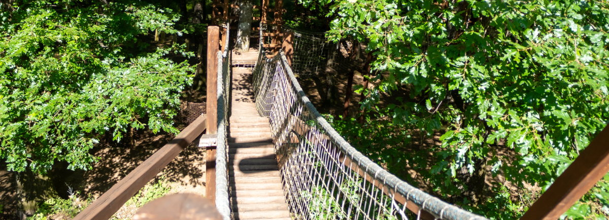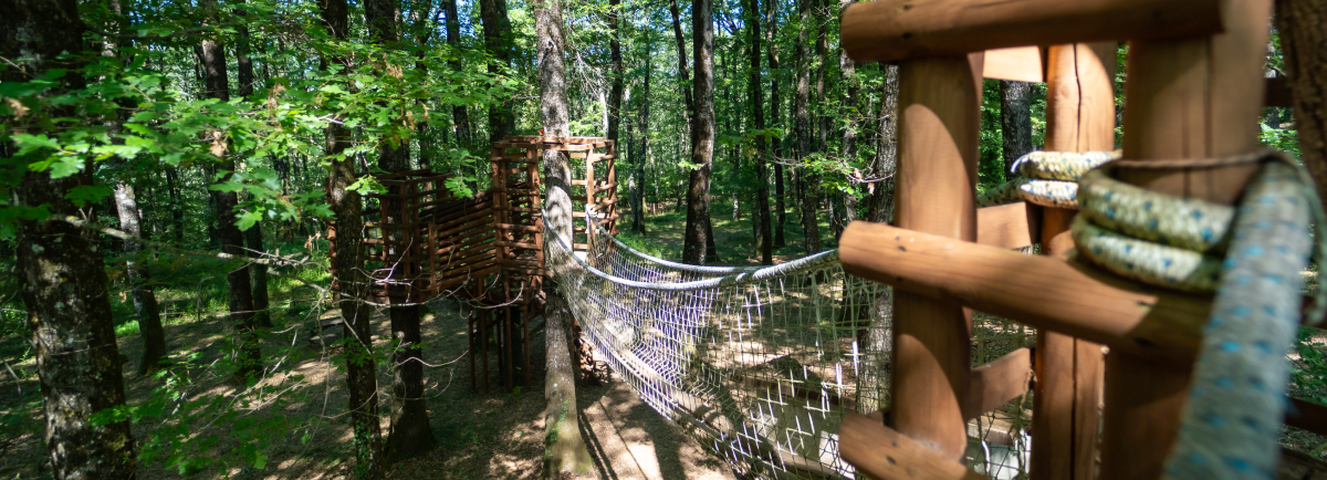 Ponte tibetano: un passaggio sospeso tra gli alberi che attraversa il bosco a circa 3 metri di altezza, offrendo un’esperienza emozionante in totale sicurezza.